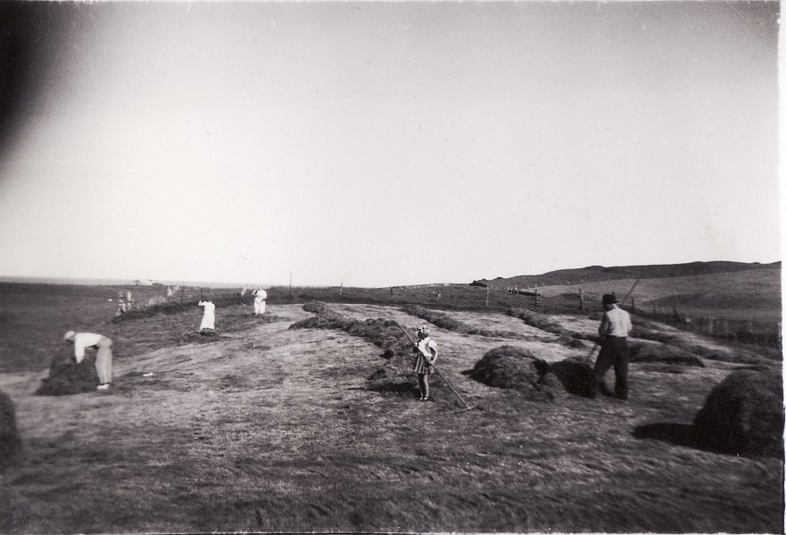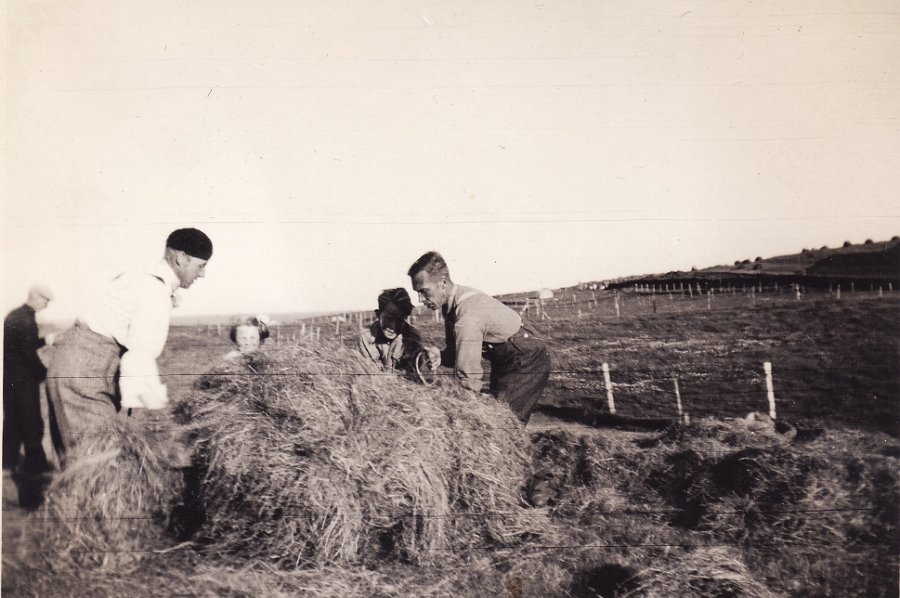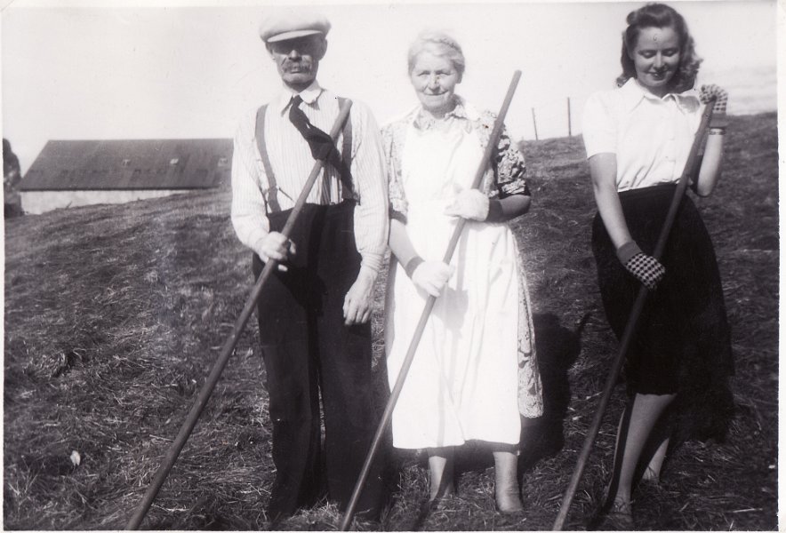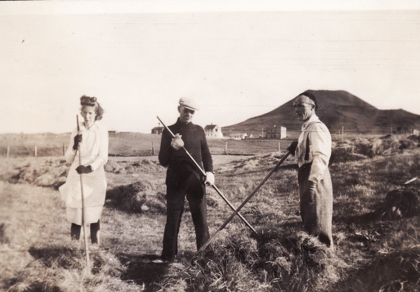 13 Heyskapur á Hofstúninu á stríðsárunum, sennilega 1942 eða 1943. Afi og amma, Þorlákur Sverrisson og Sigríður Jónsdóttir og dóttir þeirra og móðir min Guðrún Þorláksdóttir
