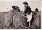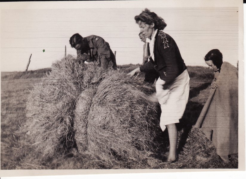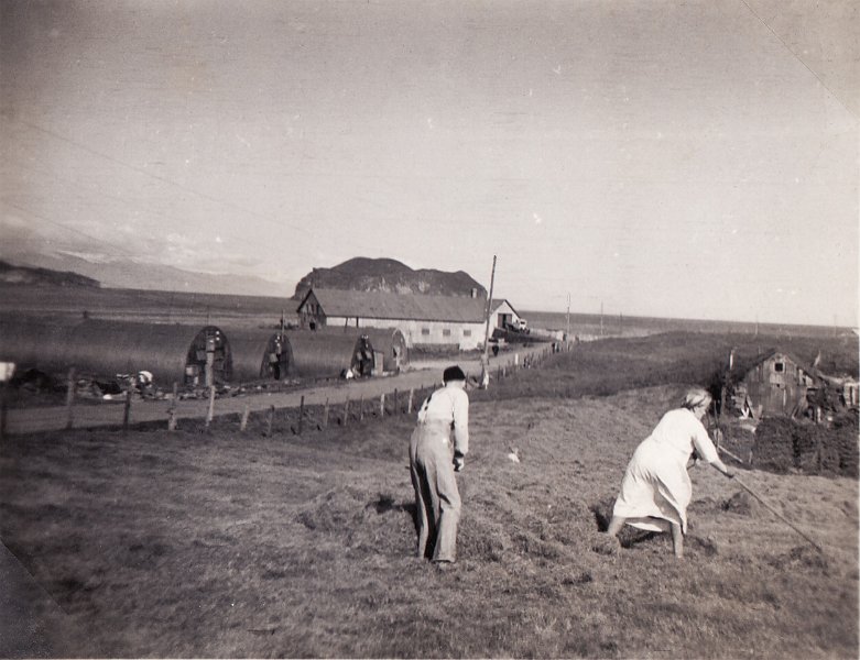 12 Heyskapur á Hofstúninu á stríðsárunum. Sigríður Þorláksdóttir bindur hey með hjálp hermanns. Sennilega er Sjöfn dóttur Sigríðar með henni