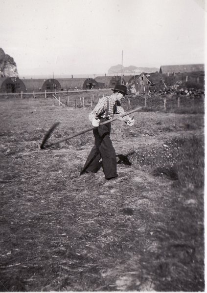 17 Heyskapur á Hofstúninu á stríðsárunum. Sigríður Jónsdóttir. Sá með sátuna gæti verið Hjössi