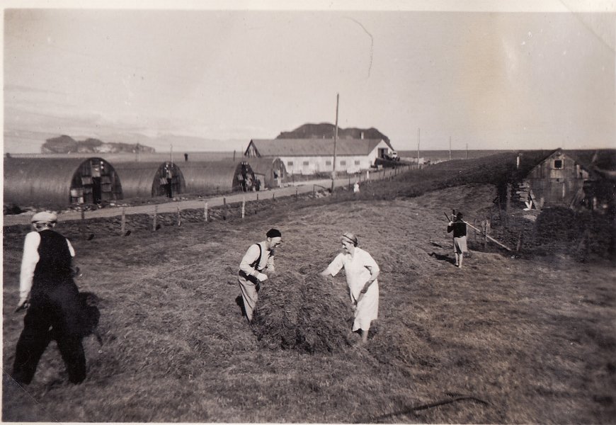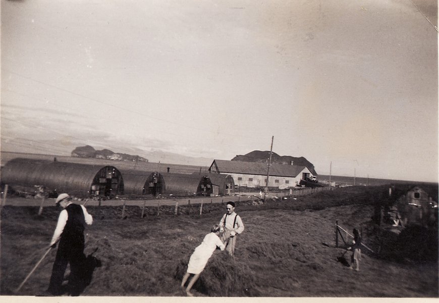 10 Heyskapur á Hofstúninu á stríðsárunum. Bjarni Guðjónsson (Bjarni skurður - með svarta pottlu). Aðstoðarmenn eru hermenn. Börnin eru sennilega Sjöfn og Sverrir, börn Bjarna og Sigríðar Þorláksdóttur, konu hans