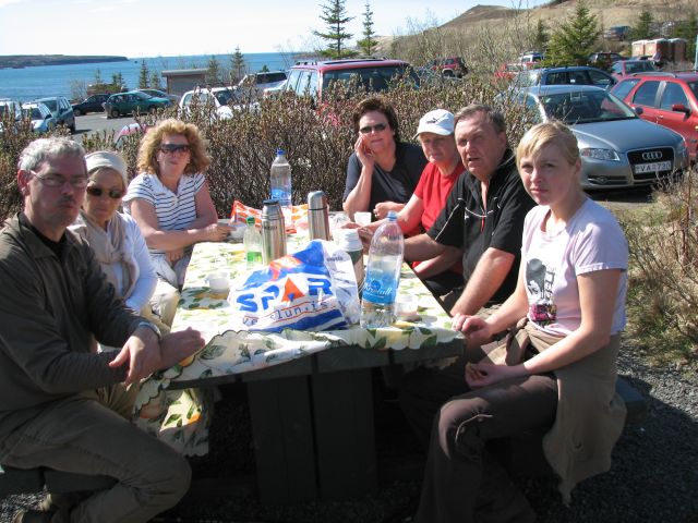 Í frábæru veðri var gengið á Esjuna ásamt þúsundum annarra þennan frábæra sumardag. Hitinn um og yfir 20°C. Það mættu flestir í gönguna enda bauð veðrið ekki upp á annað. Nokkrir fóru alla leið á toppinn en flestir fóru upp að Steini. Við fengum danska gesti með í hópinn og þau fóru bæði á toppinn. Að göngu lokinni hafði frú Alma dekkað borð og tók á móti okkur með kaffi, kleinum og snuðum - frábært í þessu yndislega veðri. Á myndinni hér til hliðar eru bara örfáir úr hópnum, en það var ekki pláss fyrir alla við borðið.